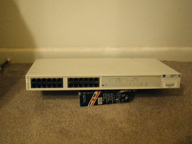 Our school upgraded our entire network to switches, so there were a bunch of hubs lying around. So picked up this 24-port 3Com Superstack Hub. Unfortunately, it overheated in December 2002 and now it's dead. It's under lifetime warranty though, so 3Com sent me a new one.