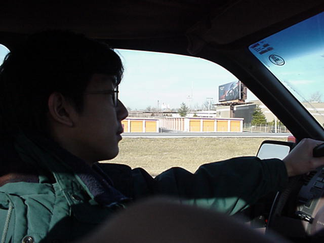 Picture - Me driving, still doing east on D. You can see a storage centre in the back of the picture beside the road out the window.
