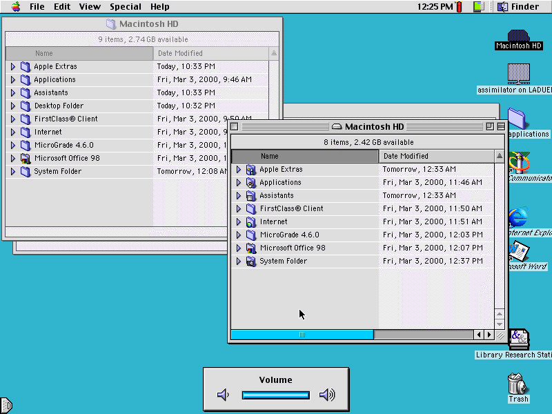 The clock on a Macintosh with OS/9 today was messed up. Check out this screen shot. roflmao. The Finder listed some files as "Date Modified: Tomorrow, 12:53PM"! roflmao. Some programmer had a sense of humour to put in the lines of code that changed it to say "tomorrow"! Because it says "today" and "yesterday" when it's those corresponding dates.