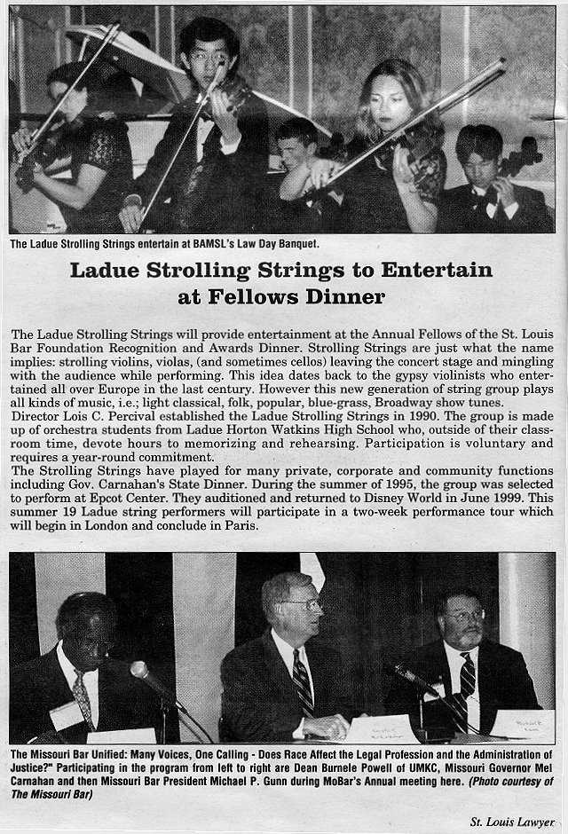 I finally got the article from the St. Louis Lawyer magazine scanned. They had a significant blurb on us and a good sized picture. Apparantly, they ripped the article right off of our brochure. Owell, it's cool, except it's out of date... we went on tour to Europe two years ago. Owell, still pretty awesome that we got on that paper. You can check out the full article by clicking on the picture to the right. I also think it's neat that an event with Governor Carnahan was right underneat our article... this was printed before he was killed in the plane crash.