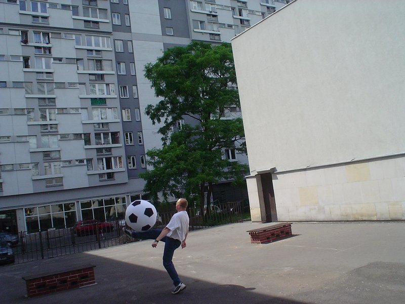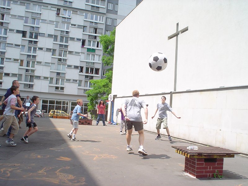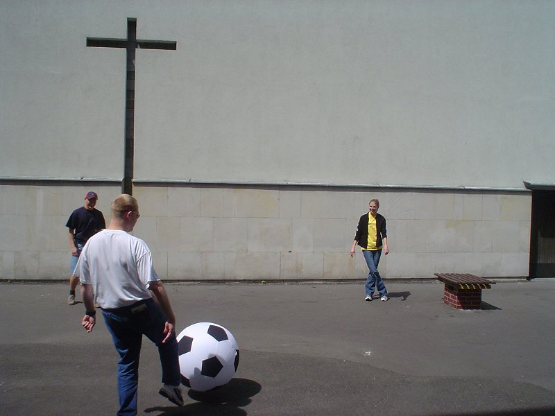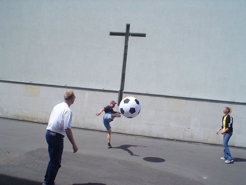 Picture - Trying out the big soccer ball outside the church.
