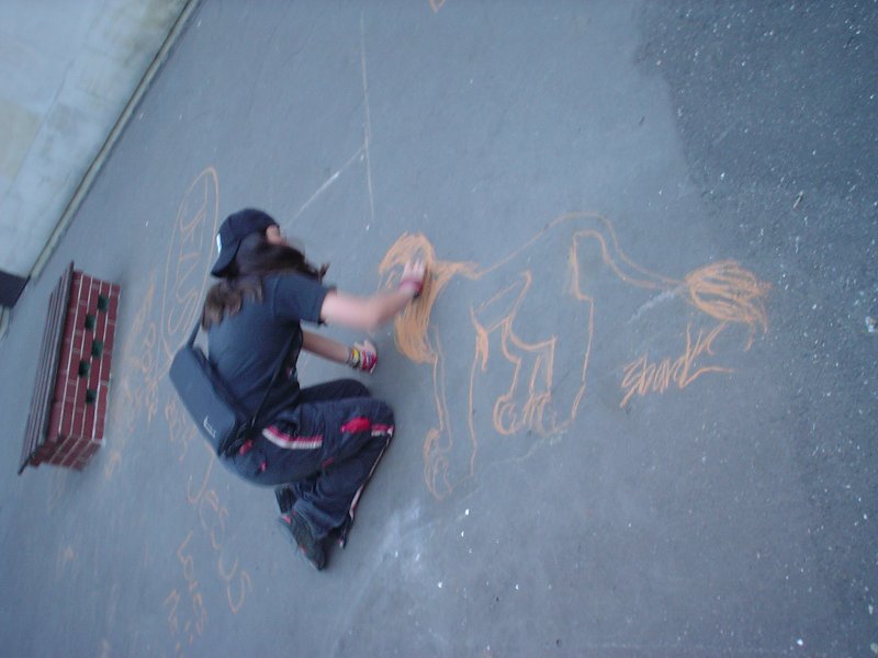 Picture - Kendall working on pavement art, but drawing with a brick.