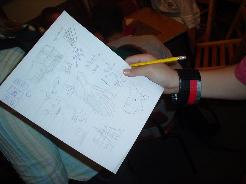 Picture - During the English Discussion sessions, Kendall communicates with some of the Poles by drawing if words cannot be communicated.