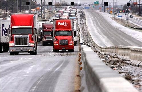 Picture - The traffic problems produced the best pictures. The busy I-35 that connects to Mexico and runs straight up Texas has been pretty much out of service. Here is northbound at Howard Lane - ice prevents all the semis from getting up the road.