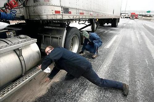 Picture - Laying sand under the tires to try to get the semi moving on I-35. Notice the semis in the background still.
