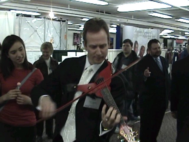 Picture - With the performance completed, I went downstairs and made one of my own dreams come true, only a little over a month after I wrote about it here. Mozingo has decided to become a dealer of Mark Wood violins. They had both a 5-string and a 6-string fretted for demonstration.