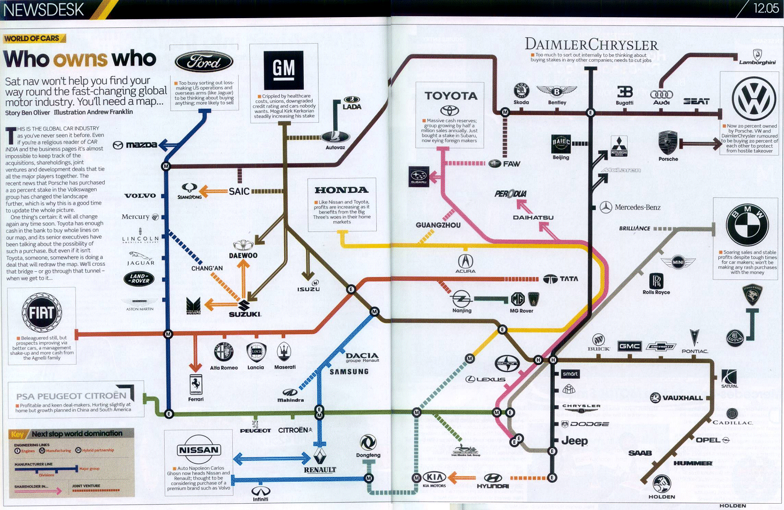 The twist on a subway map makes this the most clever way of representing such complicated material I've seen in a very long time. So complicated, in fact, that some of it is already outdated - as Lynn points out on solo2.org - "Mercedes ditched Mitsubishi several years ago. And recently got divorced from Chrysler. Ford no longer owns Astin Martin. I don't think GM is affiliated with FIAT anymore, either."