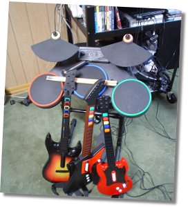 Since it's release day for the Guitar Hero World Tour Band Kit, I stopped by Gamestop to pick it up today. I assumed it would come with a USB hub like the Rock Band kit, and was disappointed to discover that the wireless guitar it comes with is instead a Dualshock port controller. It took me all day and searching around the internet to discover that this is not a bad thing - unlike Rock Band 2, you can add the microphone player with your guitar after you have completed setting everything up for the guitar. Therefore, you can have 2 dualshock guitars, the USB drumset, and the USB microphone plugged and have 4-player gaming without any hubs or adapters. I think I need to get the MultiTap dualshock adapter to play 2 guitars and a vocalist for Rock Band 2 since it requires a regular controller to select options for the vocalist.