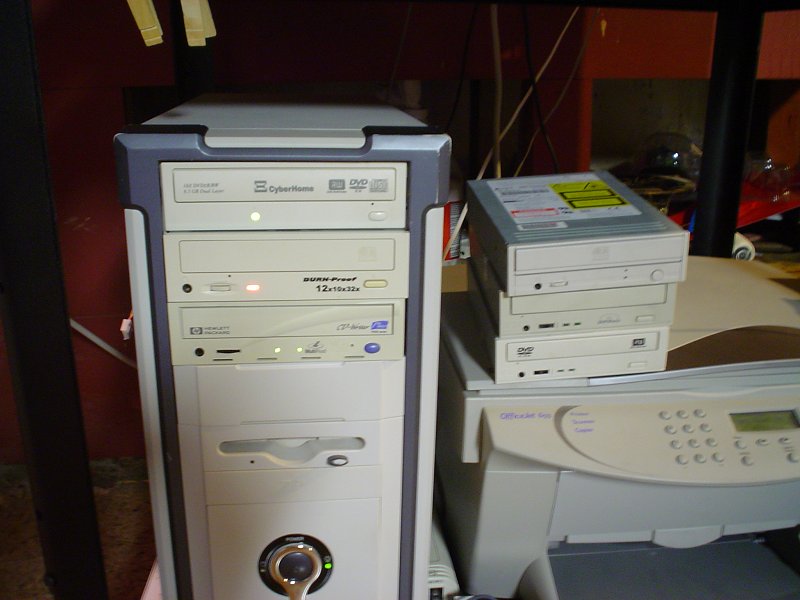 Picture - In order to efficiently burn 60+ copies of the CD we are distributing for tomorrow's 4th grade strings camp, I decided to round up all the CD burners I had in the house and plop them into one computer, taking advantage of the multiple recorders option in Nero so I can crank them out quickly. I was surprised to find that I had 10 CD burners - this could become very efficient. Since I'm "only" making 60 copies I'm not going to go crazy and try to put them all into the 10-bay tower case that I have. Besides, IDE only supports 4 devices anyway, and I'm not about to find out how many CD burners a 300 watt power supply can handle before something bad happens. Moderation is key - I put 3 in one computer, and 3 in another, so I can burn 6 at one time.