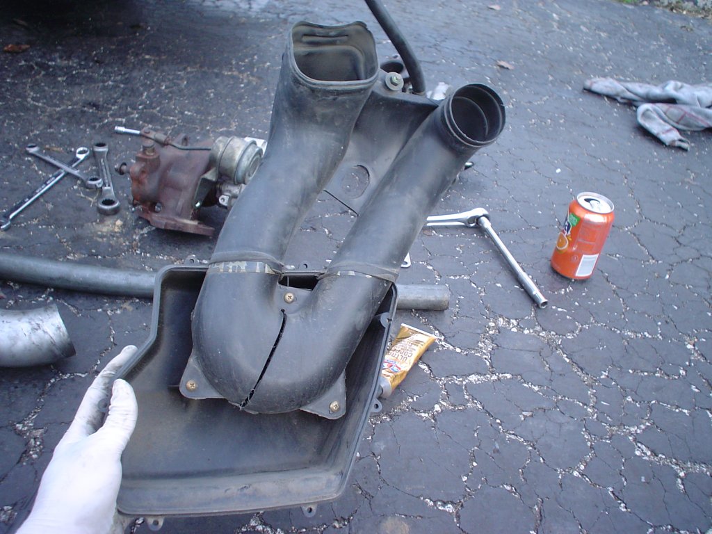 Picture - While waiting for the ultra copper silicone gasket maker to cure on that oil return pipe I took care of other less urgent things, like removing the intake silencer. I have never opened one to see what's inside so I took a look - it's not as restrictive as far as pipe diameter goes, but it does have an interest crudely cut slit to drain water.