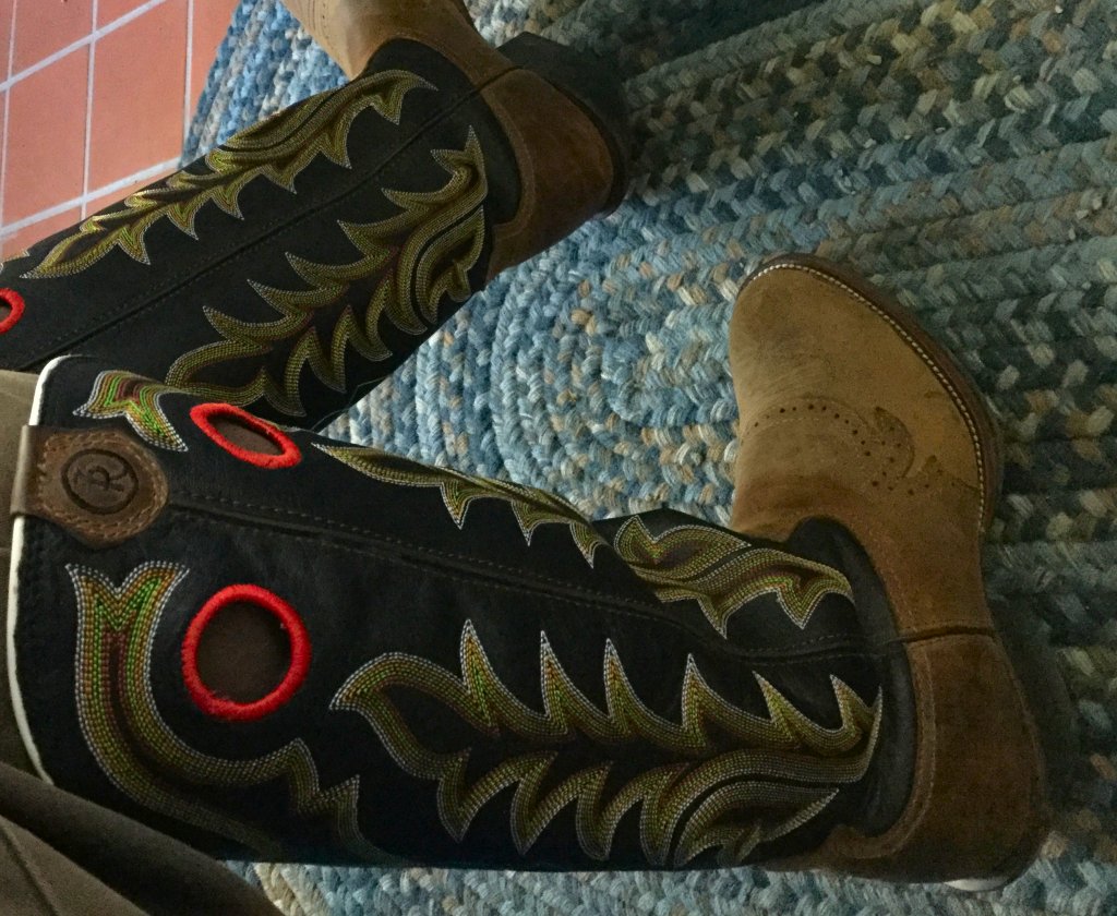 The Justin Utah Hybred WK4644 boots are for working around the ranch. The deep V scallop makes it easy to get them on and off multiple times in a short period when coming in and out of the house. The construction and materials seem to hold up well to the usual adventures here, like being stomped on by cattle or having blood splattered on. I like the traditional look of the narrow round toe over the chunky look that most work boots have.