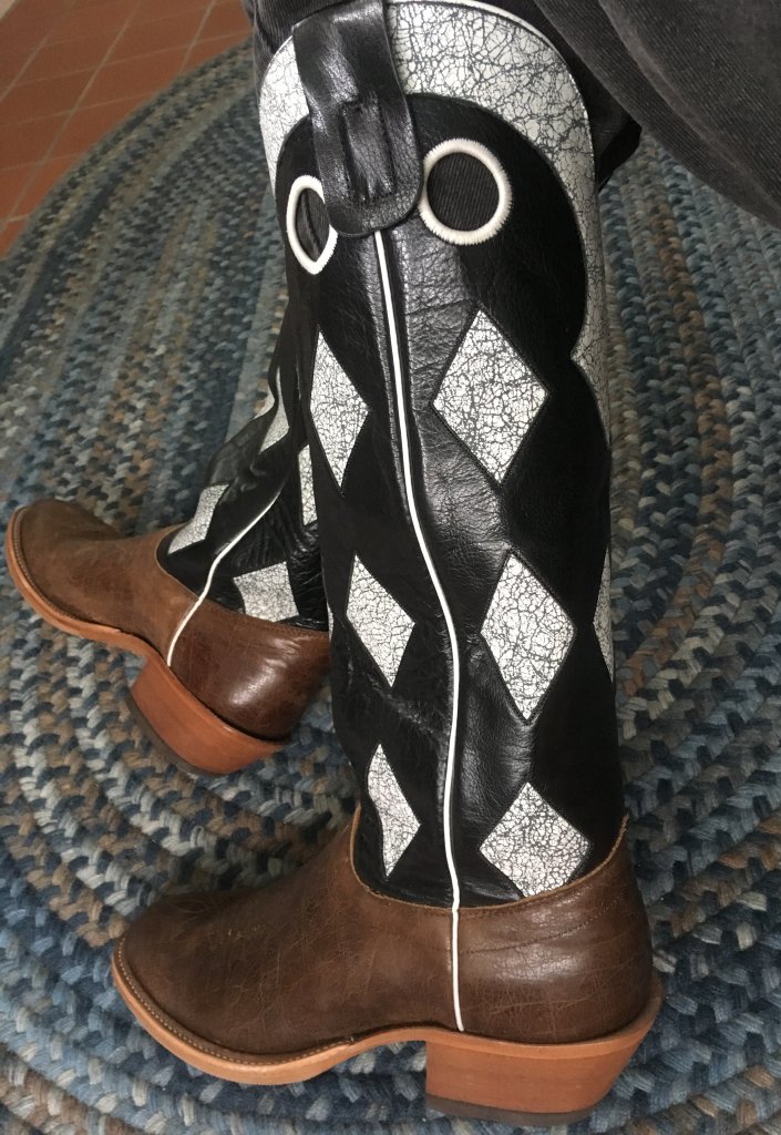 I could not resist the Olathe 252859 boots on the sale shelf at South Texas Tack any longer and finally picked them up. These appear to be from a previous era of Olathe boot design, employing pegged soles and more noticeable arch support from the shank. The lighter and softer leather might be more comfortable in warmer weather, and it is generally nice to have two pairs of Olathe tall tops to switch between so that the they have a chance to rest.