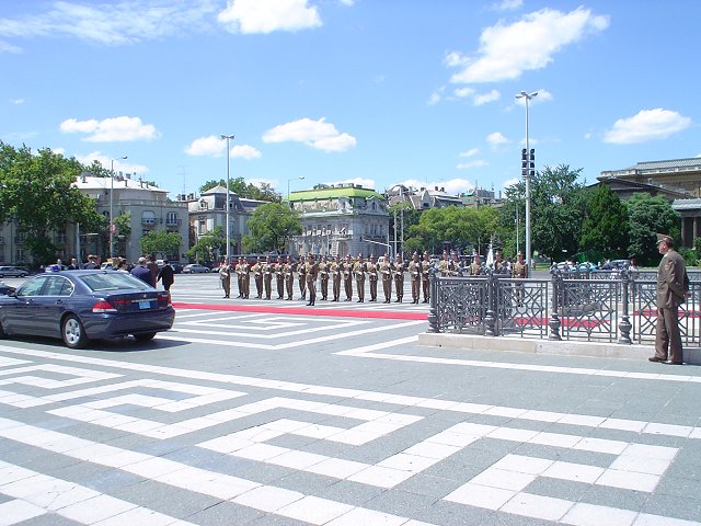 Ceremony with colour guards in Hero's Square, with the Museum of Fine Arts in the background.