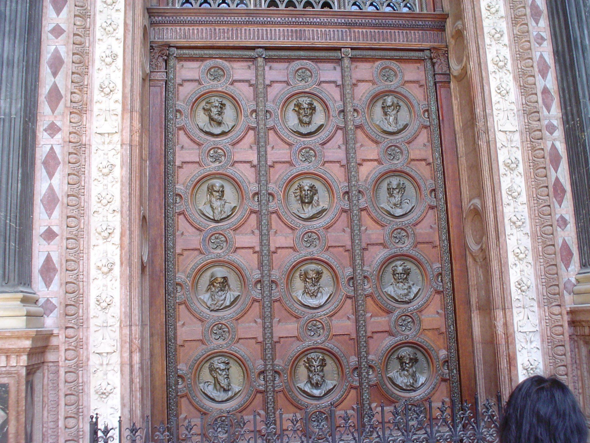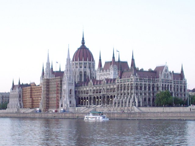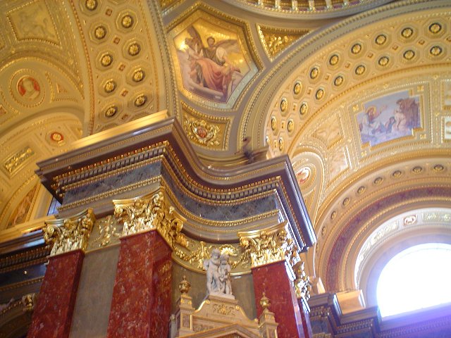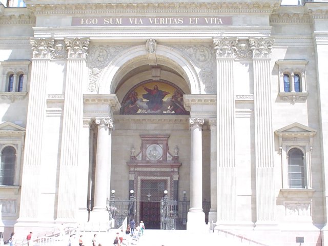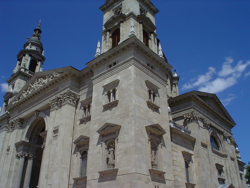 The twelve disciples portrayed at the entrance to the Basilica. The organ at the back of the Basilica. The Basilica dome from the inside. Cornice detail Sarah, Stefanie, and Hilary enjoy lunch at the city centre's pedestrian walkway. The Parliament Building from the river - some part of the exterior is always under restoration.