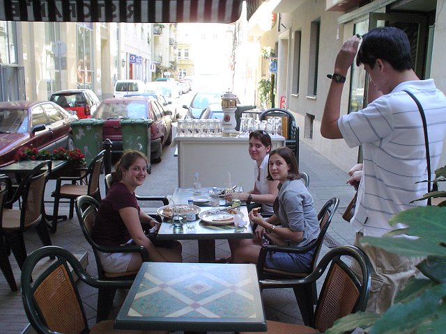 Hannah riding shotgun on the trail ride. I could have told you from the very beginning that this is how Didi, our bus driver, rallycrosses on his spare time. Hannah and the cowboy. Steafanie gets her goulash. We eat lunch with live Hungarian music playing. The black instrument is Hungarian, and produces sound by striking mallets on stretched strings. Something like a hammered dulcimer I suppose. We perform back in Budapest that afternoon at the Franz Liszt Square. (pictures taken by the Ginsburgs)