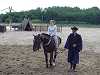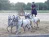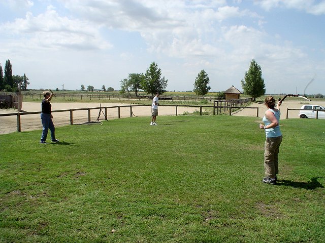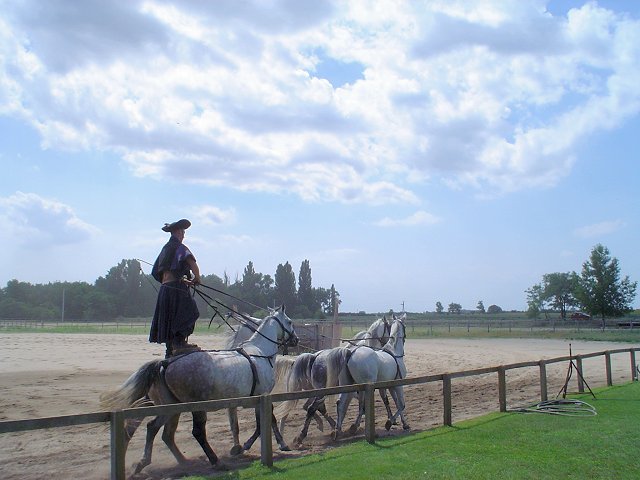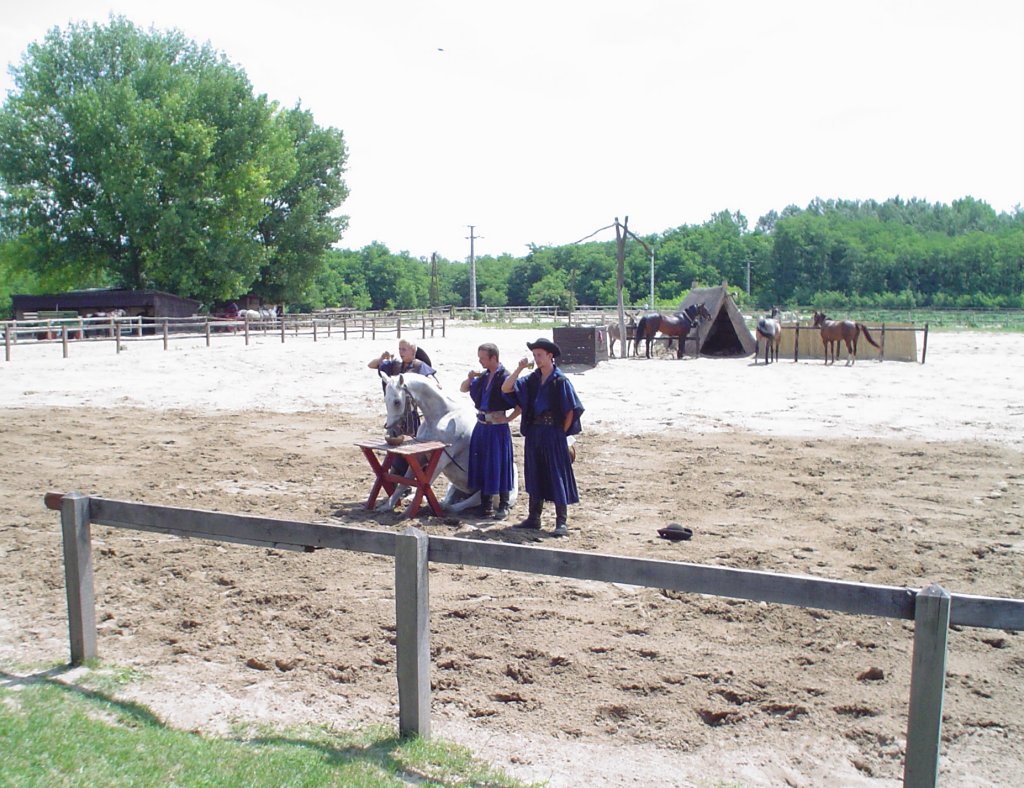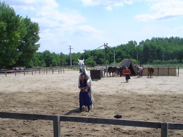 After messing with the whip, there is a Hungarian style rodeo show. Ms. Siebke gave the kids too early a curfew the night before, so the Hungarian cowboy is treating her with a traditional trick with the whip. Disclaimer: Ms. Siebke was not hurt in the process of producing these photos. The cowboys have trained the horses to be in all sorts of unnatural positions.