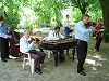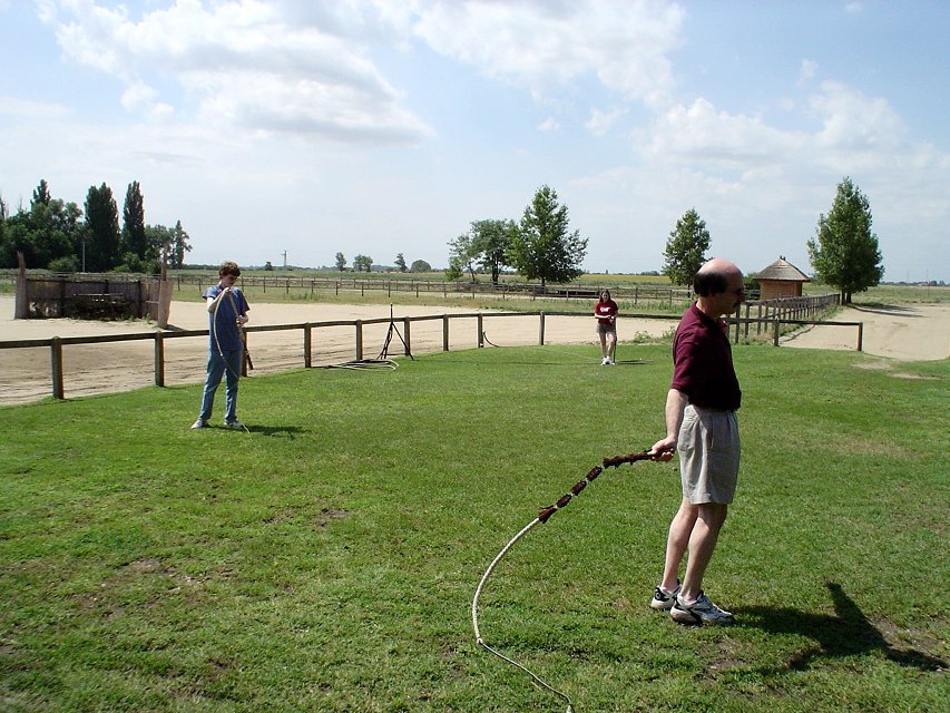 The Buda Castle lit up and night. There is a portrayal of the map of Budapest in tiles on the hotel lobby. Is the one reading the newspaper from our group? Sure is. "Look at Ms. Hollywood", says Mr. P. We unload at the farm at Kecskemet. Recent dry weather has caused the dirt to turn into sand in the rural areas. Reid's a nice guy. He offered to carry everyone's backpack while we were there. Everyone takes turns trying to crack the whip.