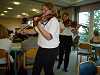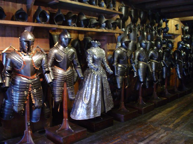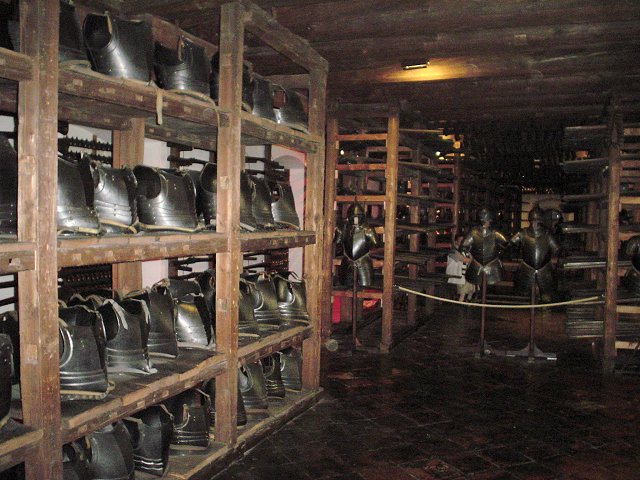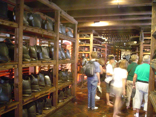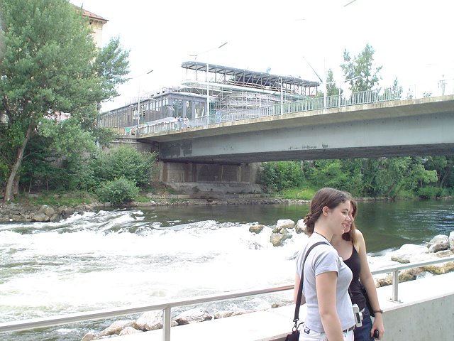 With makeshift wind screens on our microphones now, we make our way to Graz. The thumbnails that follow will direct you to pictures from Graz. Graz, AustriaLunch en route to Graz - a typical situation. Helmut, our tour guide for the entire trip, explains to the waitress what people wanted to eat while we looked over the menues. Kevin's an expert at avoiding sunburn. Being skinny also helps when you're trying to use the shadow of a flagpole to block the sun. Rapids artificially constructed in the Mur River in Graz. Fascade of a building in Graz. The streetcars run through a pedestrian zone, which is decorated by blue and green lights to celebrate Graz as the European Culture Capital of 2003. Architecture of a square in Graz. The sewed together clothing to make a red-carpet-type walking path for us to walk on. Firearms hung from the ceiling, and the racks were full of old muskets. The museum also had an impressive collection of antique knives and swords used in battle. The women were also stylin' with their armor. This is one of the more modern items in the museum.