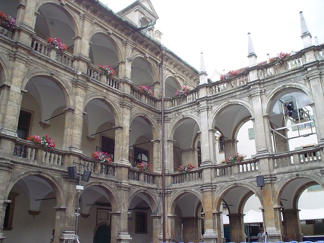 Of course, we have to have armor for the horses too, right? Halfway through the tour it started raining. It only lasted a few minutes, though, and the sun came out again. Rapid changes in weather were common througout the entire tour. A backery that has been around since 1569. Stairs leading down from the 13th century Graz clocktower, which sits on the Schlossberg. The countryside along the drive up to Bad Gams. Performance at Westeirische Hof. (picture taken by Mrs. Thomas) An underground retail area next to our hotel in Graz. Salzburg |