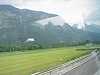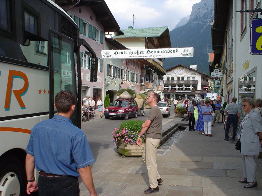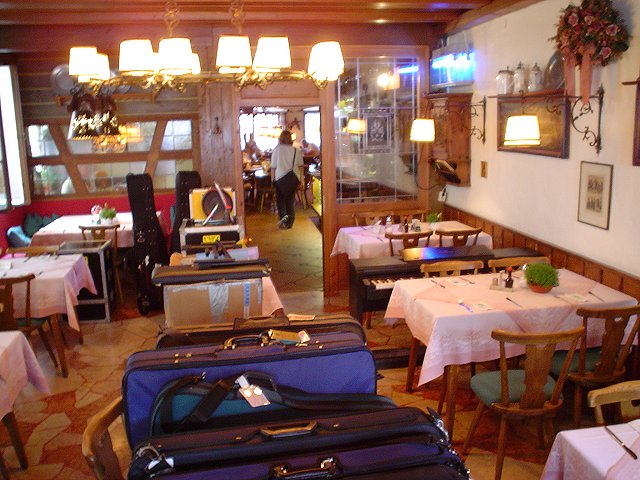 "Climb every mountain..." As much as I would have loved for a picture of us in the Alps, we didn't take the time to organize it so this is as close as it gets. I would also like the motorcycle in the Alps like this fellow, but I don't think that can be arranged. Our tour bus in the Alps The German Autobahn through the Alps. The city center of Mittenwald, with a little channeled stream that runs through it. The restaurant we ate at for lunch was nice enough to let us store our sound equipment there, since obviously the bus couldn't wait anywhere while we ate lunch, set up sound, visited the violin museum, and go do some shopping. Of course, this was the back room of the restaurant - we had to schlepp all the stuff through it first. Let's hear it for the red Subaru Legacy - in Mittenwald.