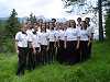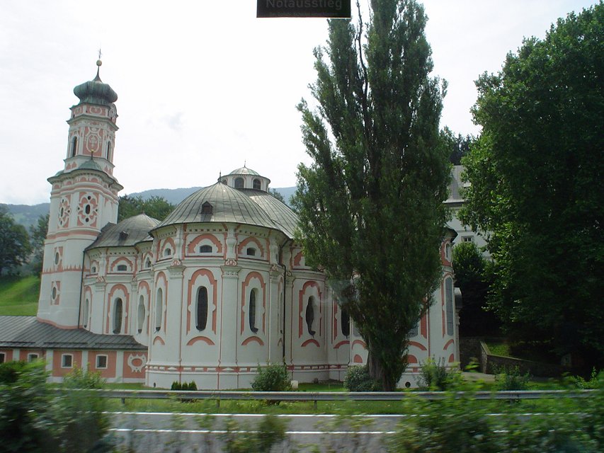 View of the Alps at the Swarovski factory We have avid fans of Lance Armstrong with us, and they've been tracking his progress in the Tour de France for the entire tour. On the bus ride to Mittenwald, Hilary and Rebecca serenade us with Lance Armstrong songs. The tunes sound awfully familiar, though. Movie - Here is the end of one of the Lance Armstrong waltzes that calls for his picture being put a stamp, considering the USPS is his biggest sponser. More of the countryside in the Alps
