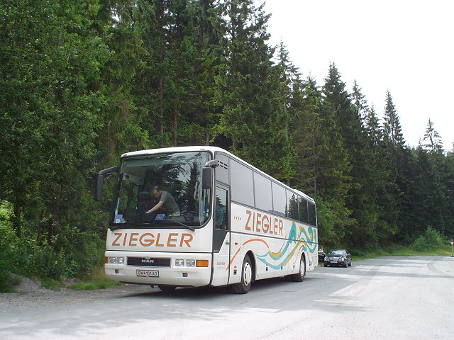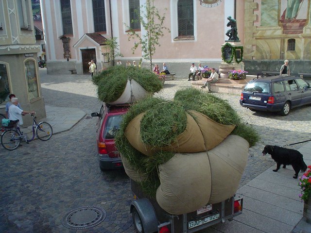 How about the red Forester? It's time to back the tour bus into the small roads of the city center and load the sound equipment. Didi and Helmut makes sure that everything is on before we pull out - not that we can wait around with this gigantic thing blocking the road or anything. The red Forester is schlepping quite a load of... grass. Hannah, flowers, the Alps, and a silver Audi Allroad. It doesn't get much better than that. SMART car in Mittenwald München |