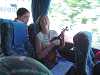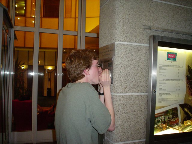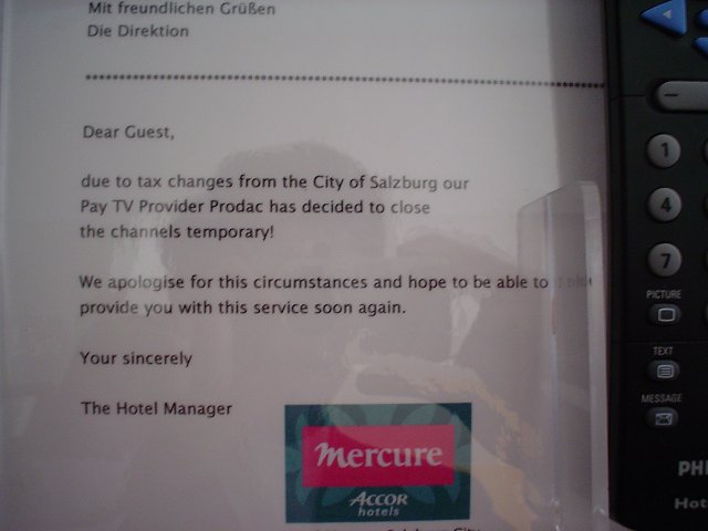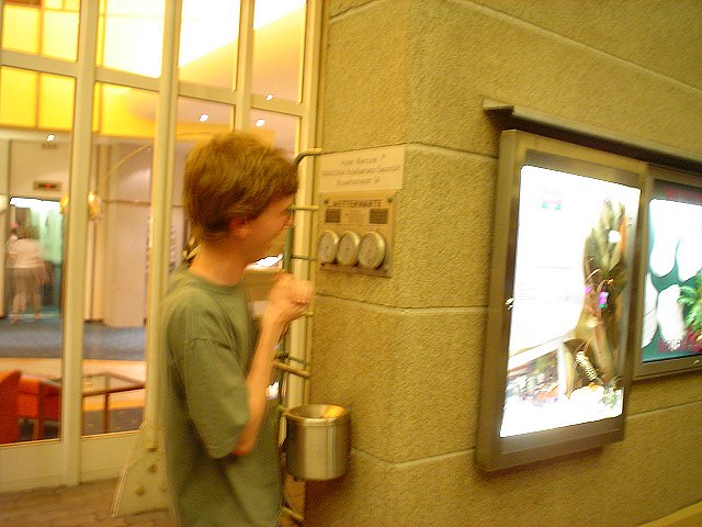 A view of the the Residenzplatz, with the Horse fountain in front of the Salzburg Cathedral and Residenz, and the St. Michael's Church to the right. A sleepy bus after a day spent walking around in Salzburg. I was trying to read the hygrometer outside the hotel, only to see it rise 1% as I breathed on it. Kevin one-upped me by modifying the humidity reading by 10%.