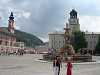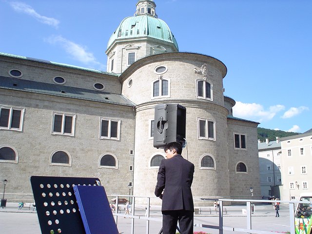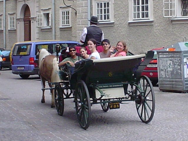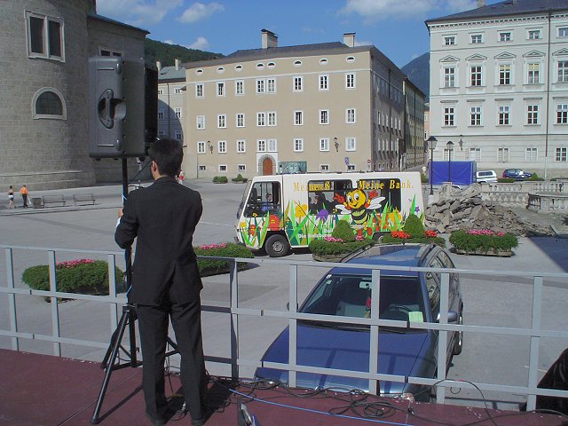 Maybe the curfew extension was not such a great idea after all. In Salzburg, another form of mass transportation that's popular are electric busses that draw electricity from the power grid. We found this explanatory letter in our hotel room. Helmut, our tour guide, leads us through the streets of the Salzburg city center to get to our concert venue, Kapitelplatz. Arriving at Kapitelplatz Unloading the sound equipment off of the minibus Performance at the Kapitelplatz (pictures taken by Natalie)