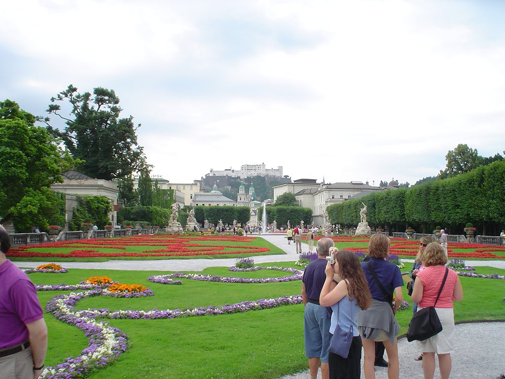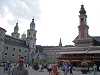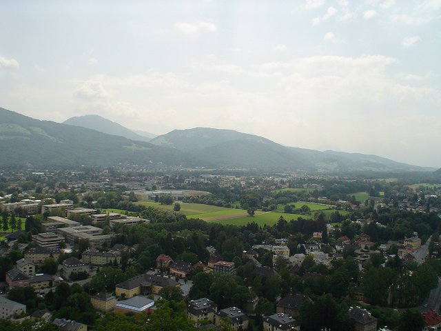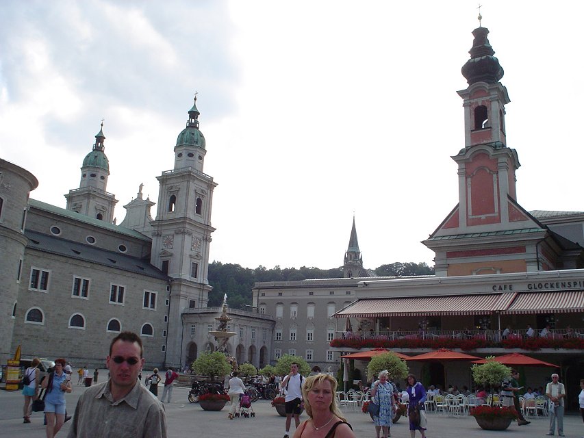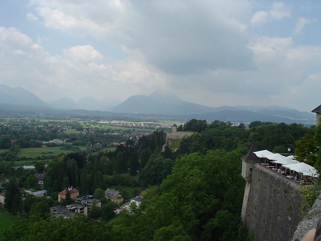 Sarah has fun with the toys they've provided in the hotel lobby. View across the Salzach River towards the old downtown Salzburg, with the Salzburg Castle dating from 1077-1500 sitting on the hill. The view of Salzburg from the castle, with the Kapitelplatz in the lower right corner.