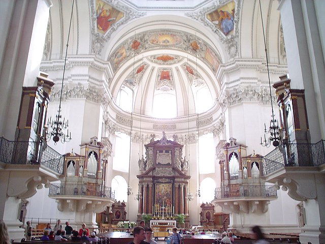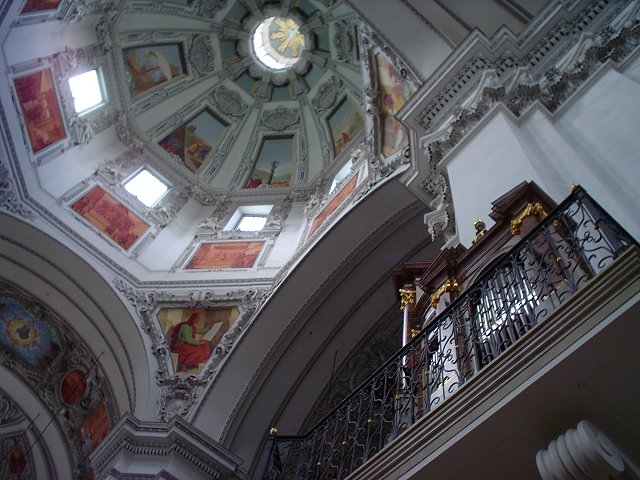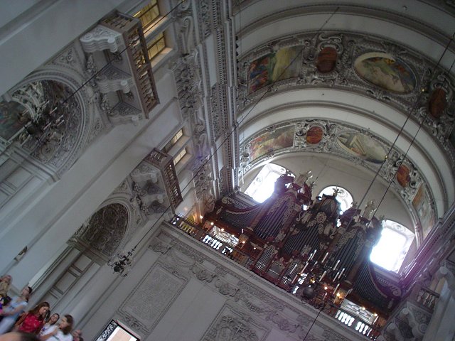 Climbing our way into the castle for the chamber music concert held there that evening. View of Salzburg from the top of those stairs. The view from the other side of the castle - mountains in Germany. Inside the castle, before entering the concert hall. Playing with the toys in the hotel lobby. Mirabell Gardens, looking towards the Salzburg Castle. The girls doing their Sound of Music pose at a gate where they filmed part of the Do-Re-Mi song. Mirabell Gardens, looking towards the Salzburg Castle. The baroque Horse fountain in the Residenzplatz in front of the new carillon of the Bishop's Residenz. St. Michael's Church sits on the left. Inside the Salzburg Cathedral, with a view of 4 of the 5 original organs, each with mirrors for the players so they can see the conductor stading on the Cathedral floor when a piece that calls for 4 organs is being played. The fifth organ in the rear, a contemporary model. More views inside the Salzburg Cathedral
